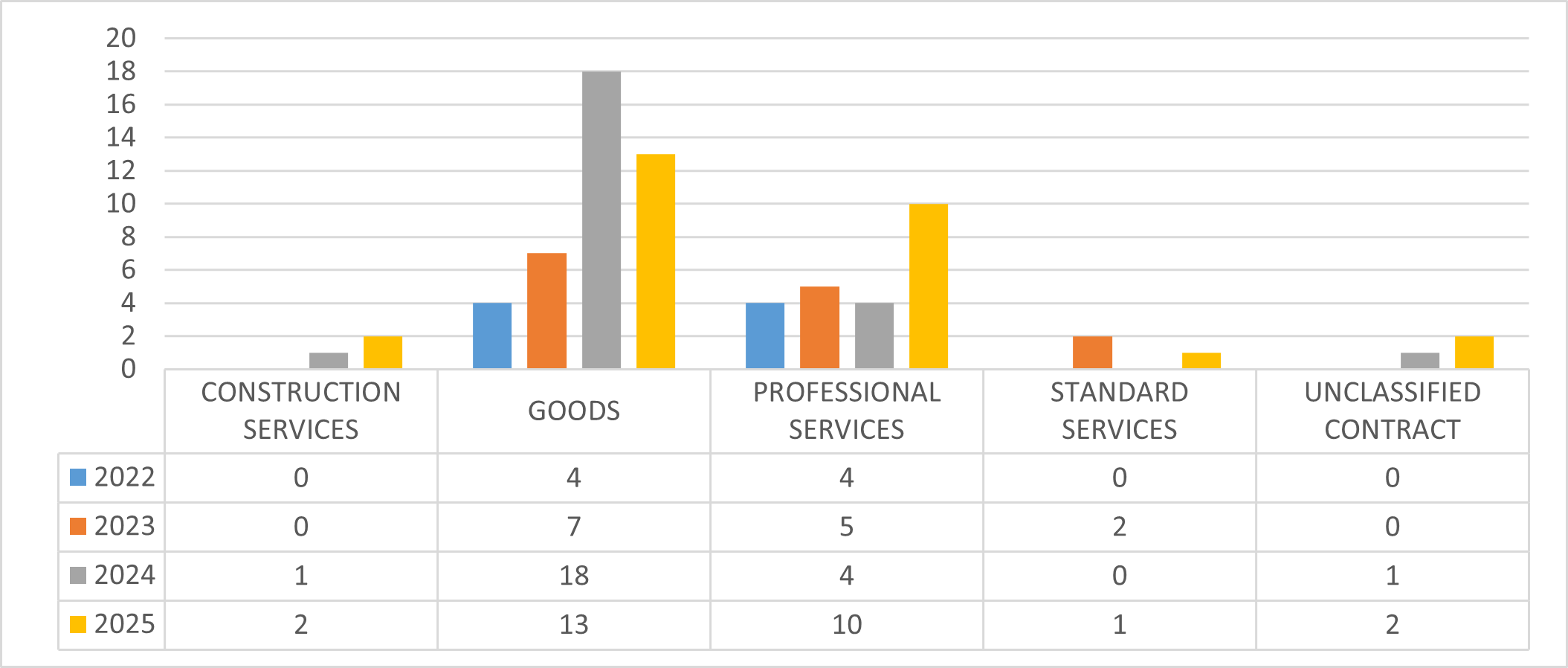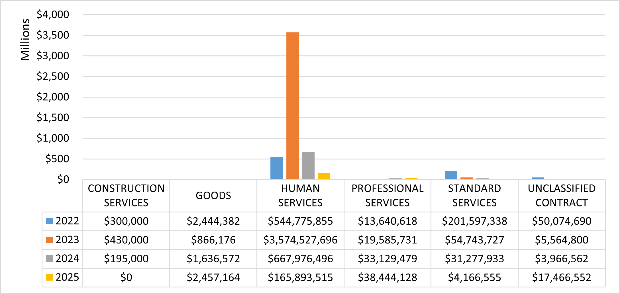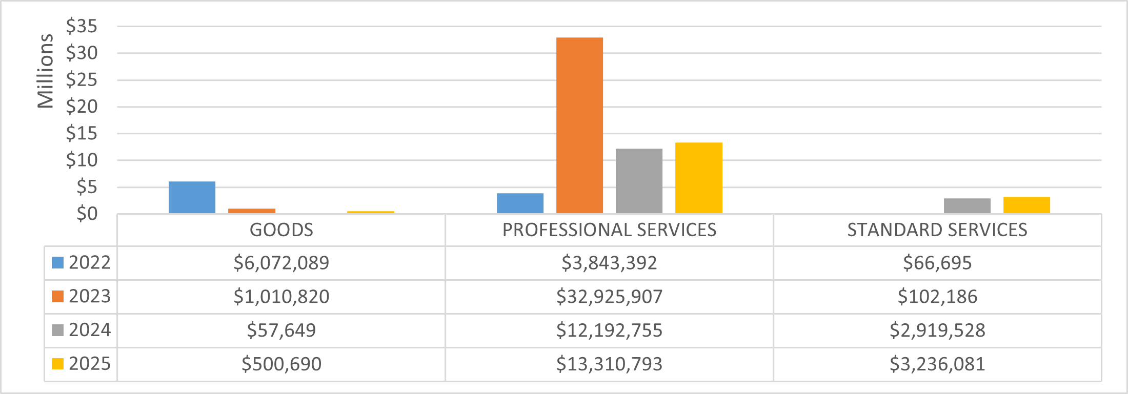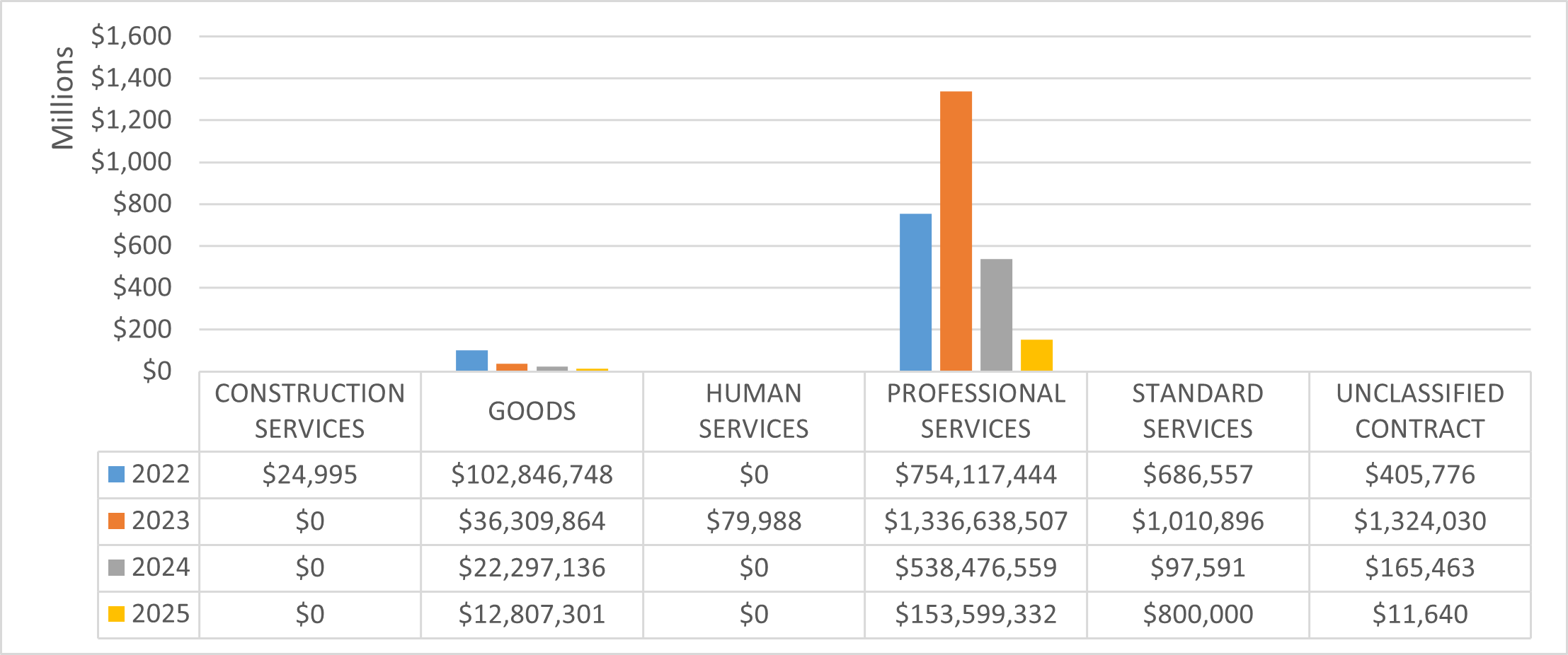 Our analysis also found that the average contract value was $750k more in FY25 than it was in FY24[9]. Chart 2 shows the average value of a contract in FY22, FY23, FY24, and FY25.