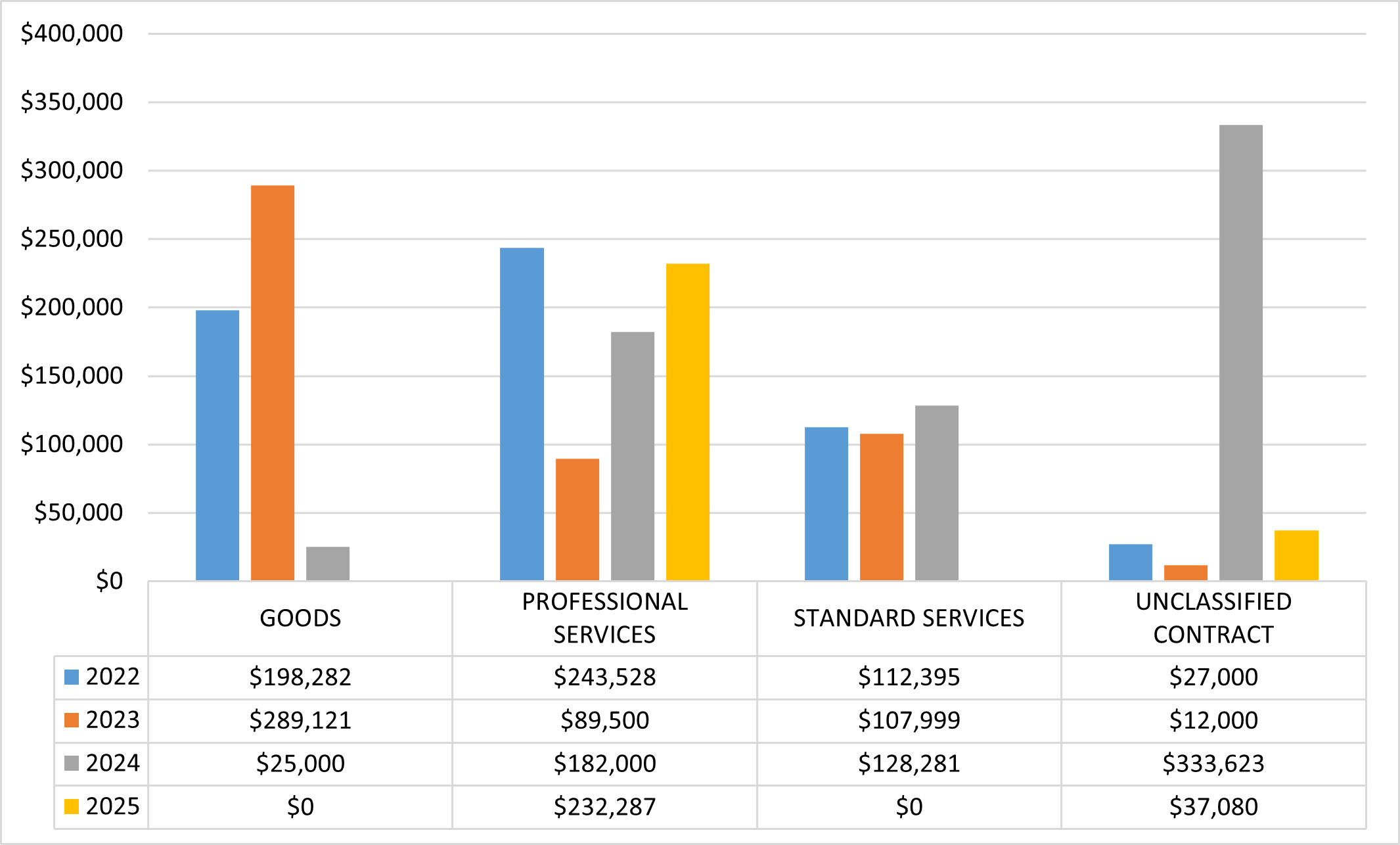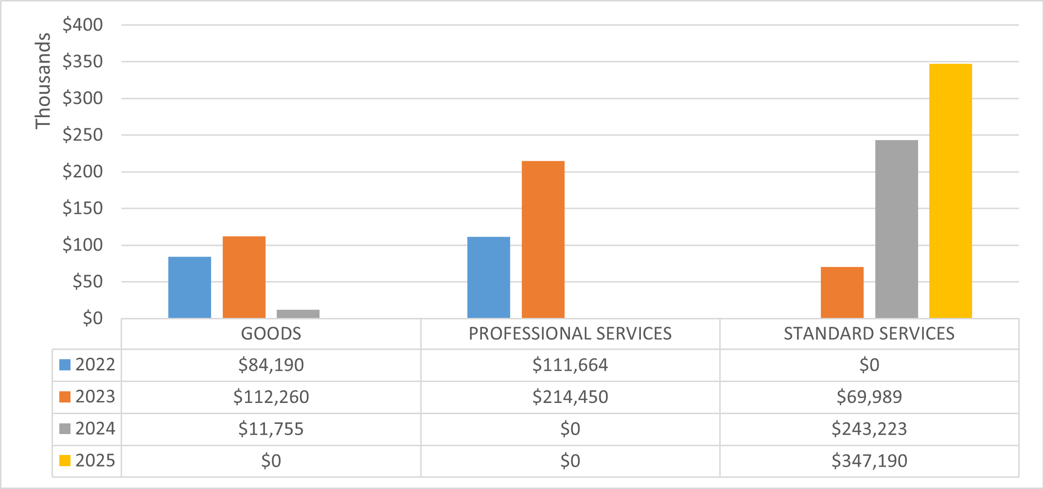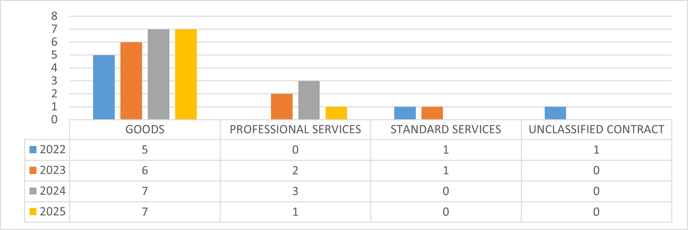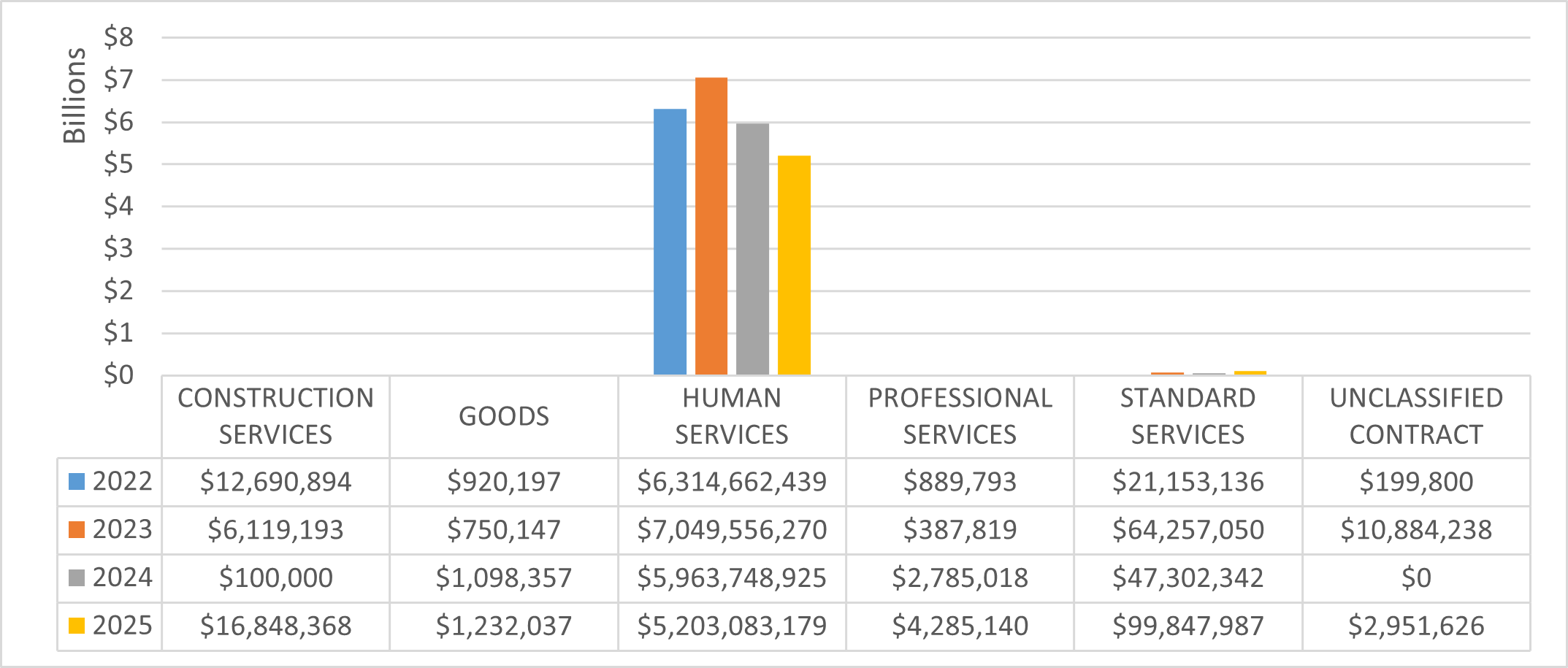 Our analysis also found that the average contract value was $750k more in FY25 than it was in FY24[9]. Chart 2 shows the average value of a contract in FY22, FY23, FY24, and FY25.