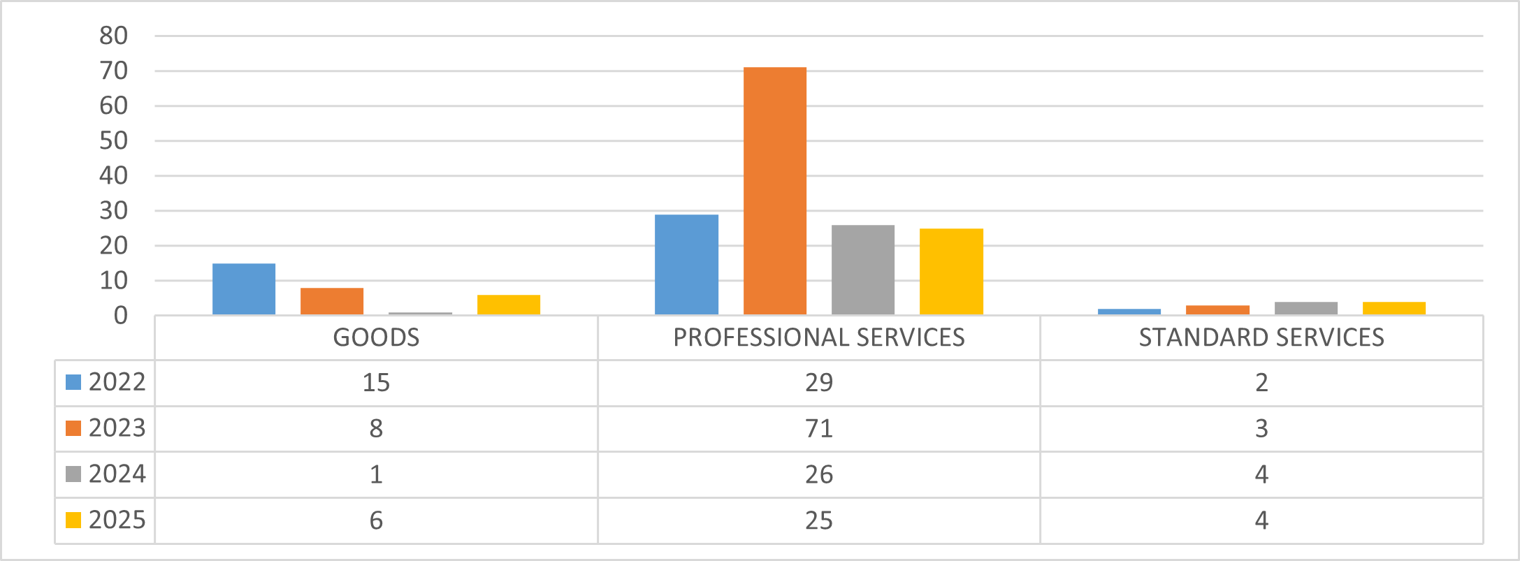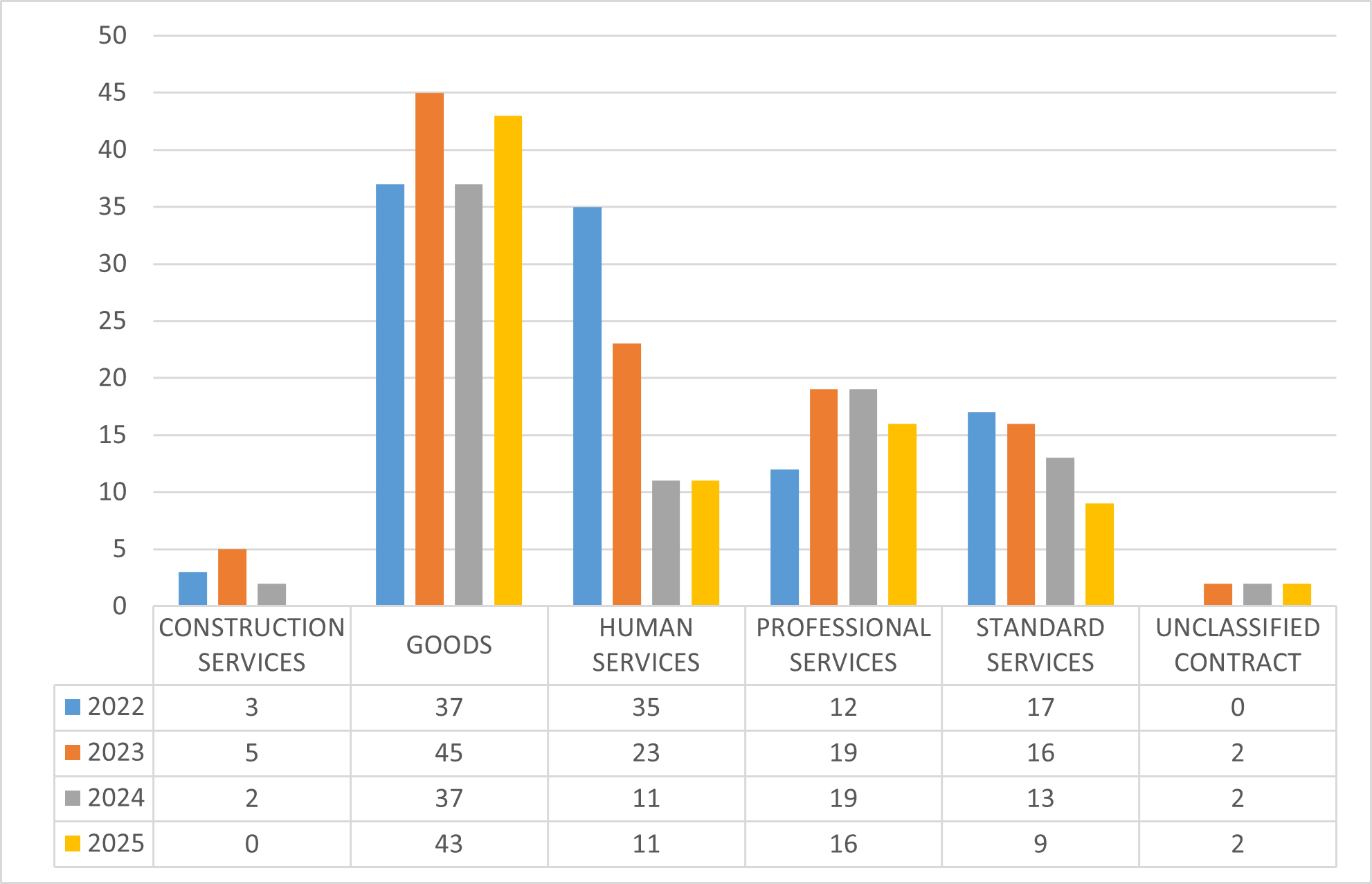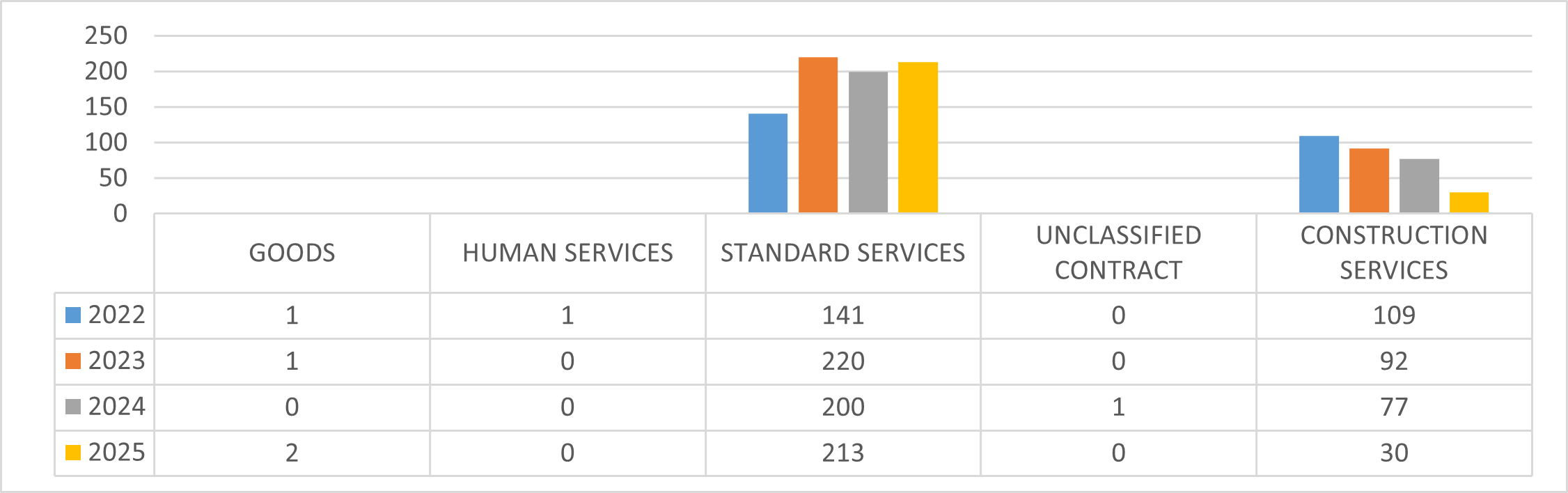 [17] Note: the value of the Innovative Procurement contracts in FY25 was overwhelmingly driven by contracts for the BBJ program. This program makes use of the “Design-Build” project delivery method, which is intended to expedite the completion of major public works projects. Design Build uses a two-step qualifications-based procurement process to select a single team of designers and builders to support public works projects from start to finish. The use of this method allows City agencies to make a contract award to a single vendor, based on Best Value, that will be responsible for overseeing all phases of the project, including design and construction. By going through a single vendor, Design Build is ultimately intended to reduce costs and expedite project completion while ensuring quality control and compliance. While these contracts were competitively bid, Design-Build is still considered an Innovative Procurement method and is classified into group 2 accordingly. Refer to our Contract Primer for more information about Design Build and Innovative Procurements.