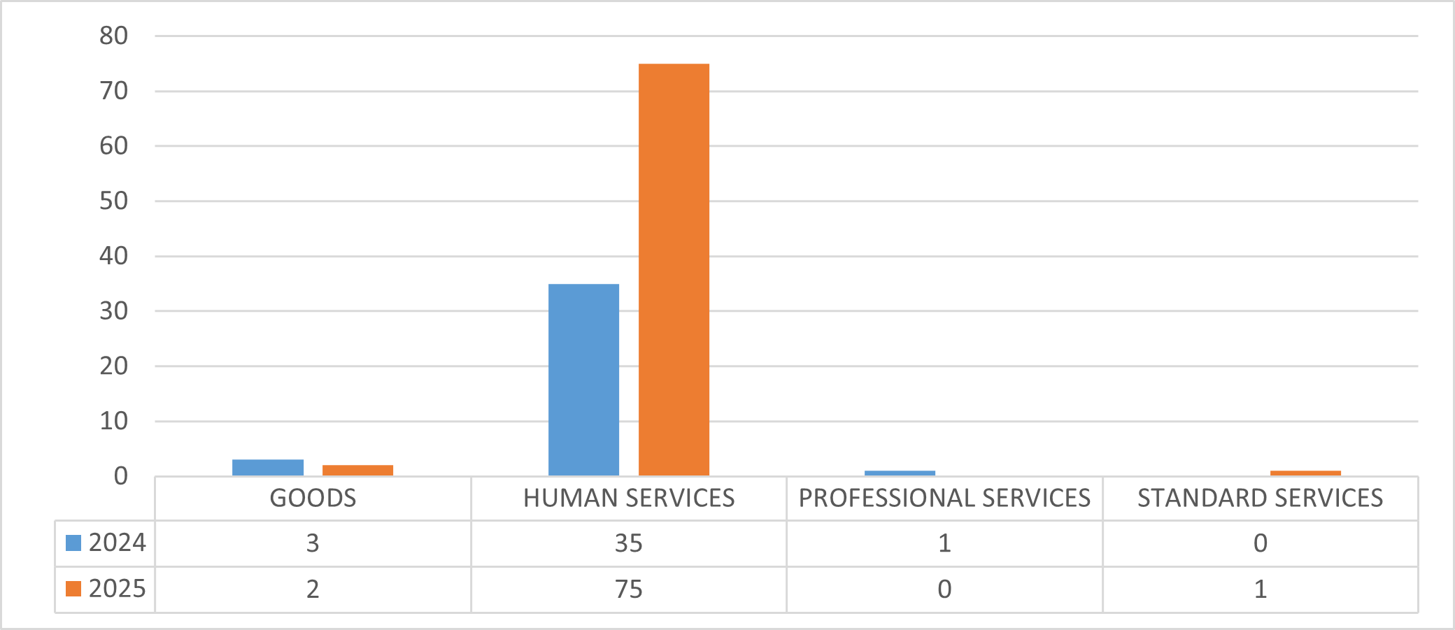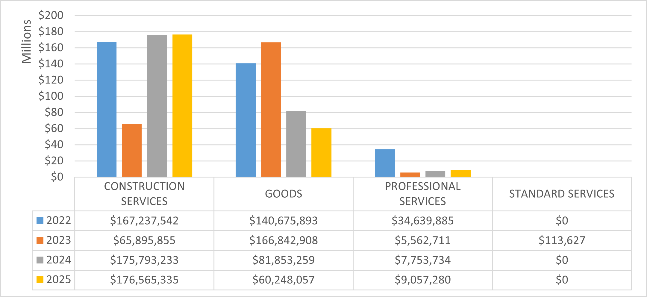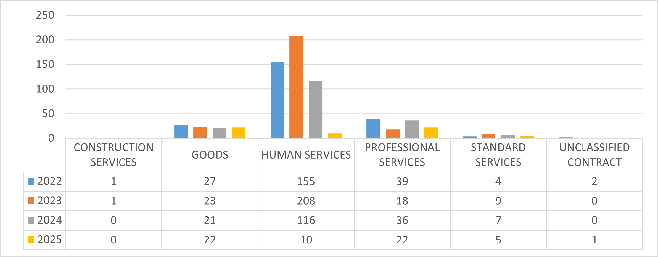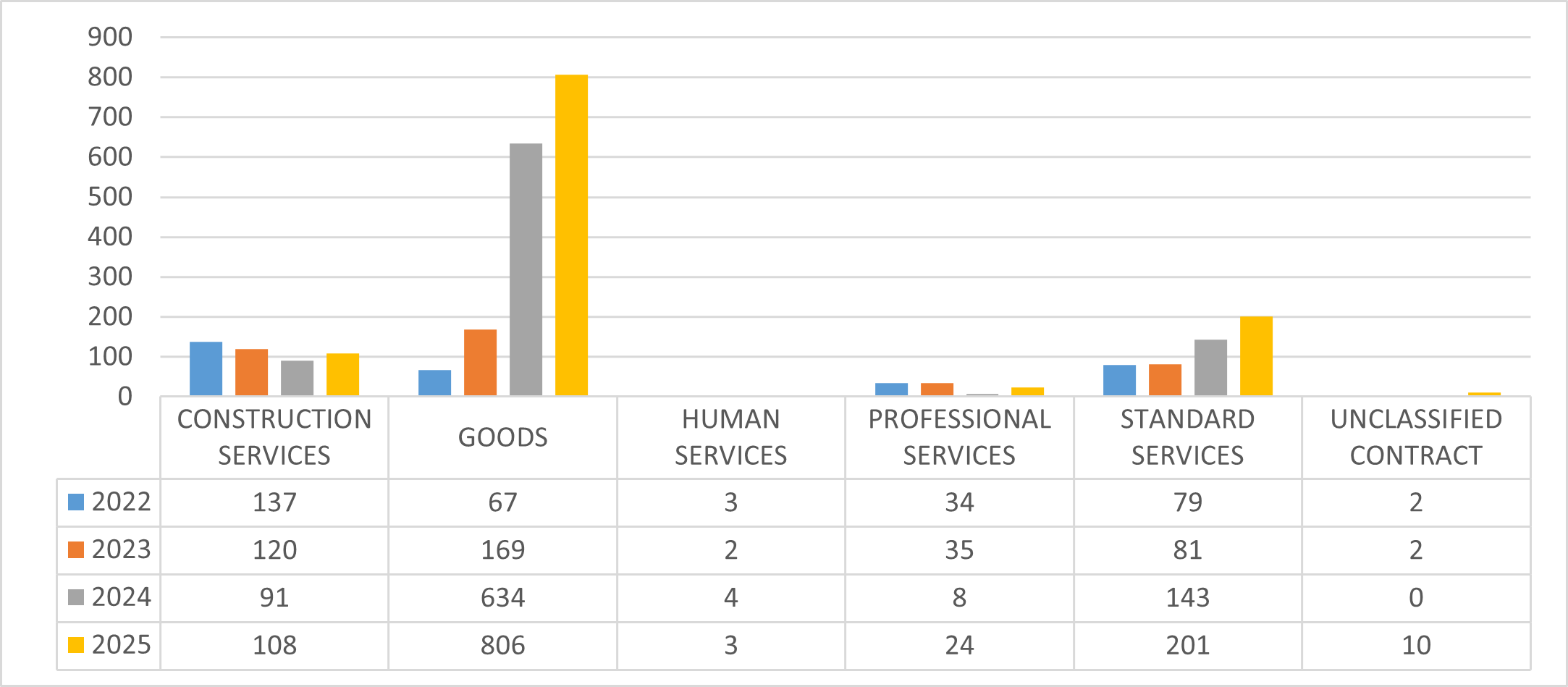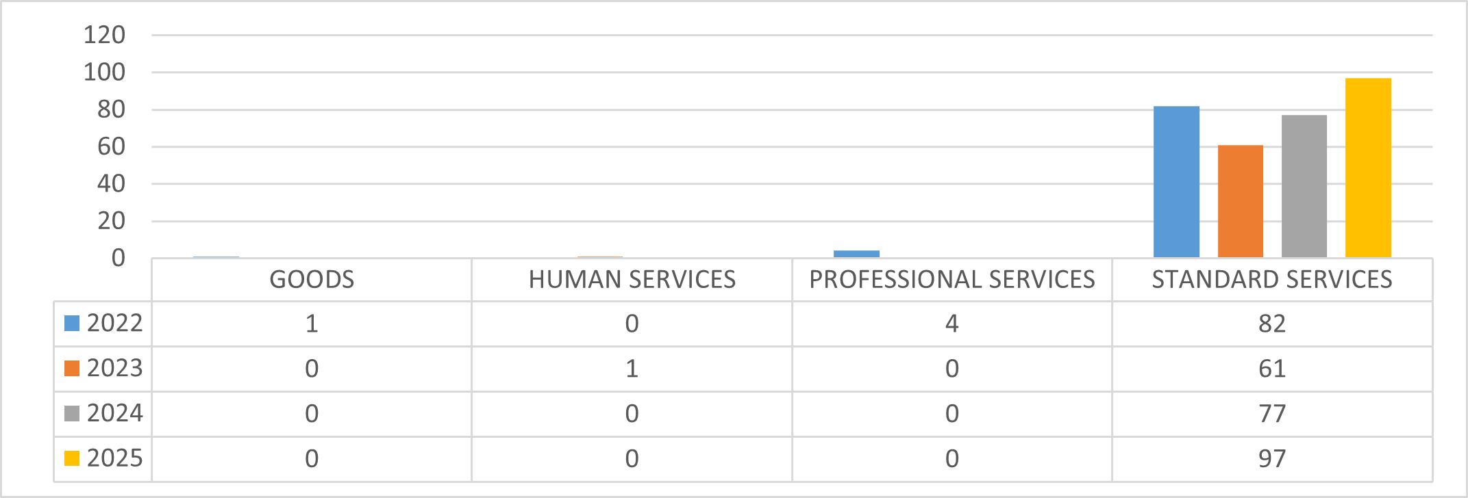 Table 2 illustrates that just ten agencies account for 86.61% of the City’s FY25 procurement value. The Department of Design and Construction (DDC) makes up the largest share (32.11%) of the City’s procurement value. This is because DDC is the contracting agency associated with various billion-dollar borough-based jail contracts.