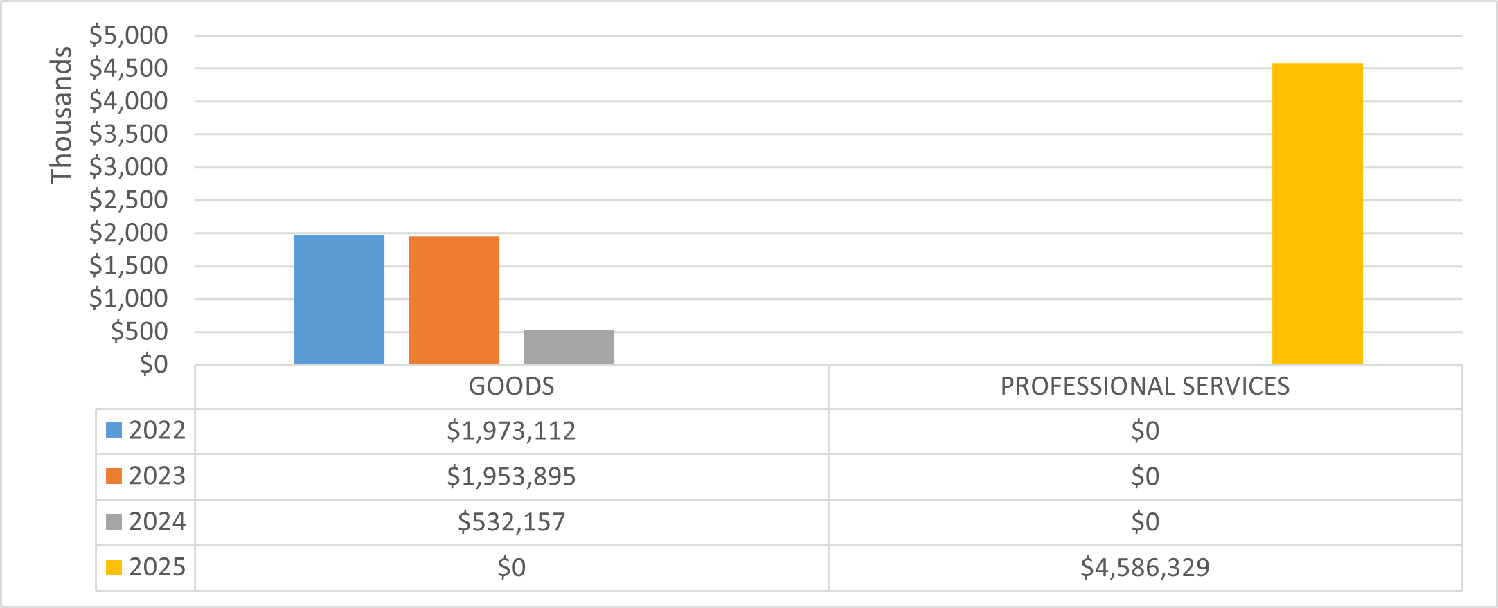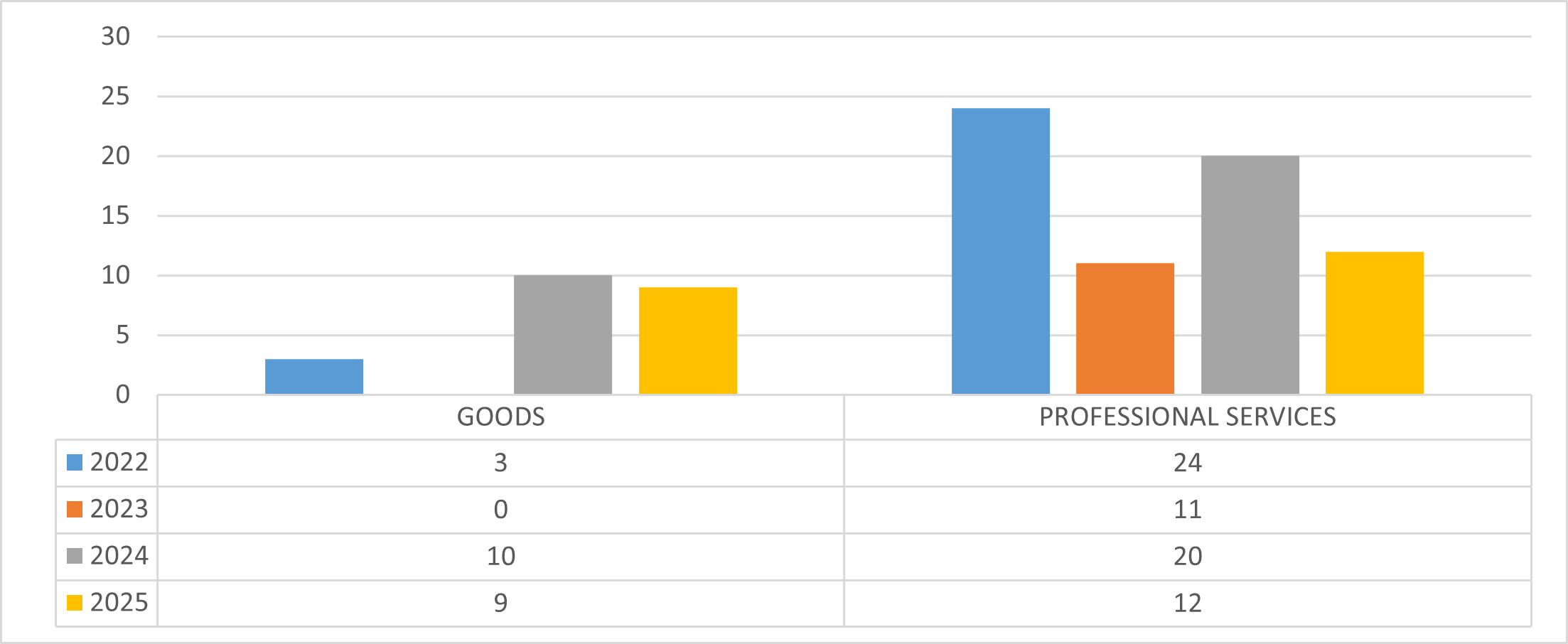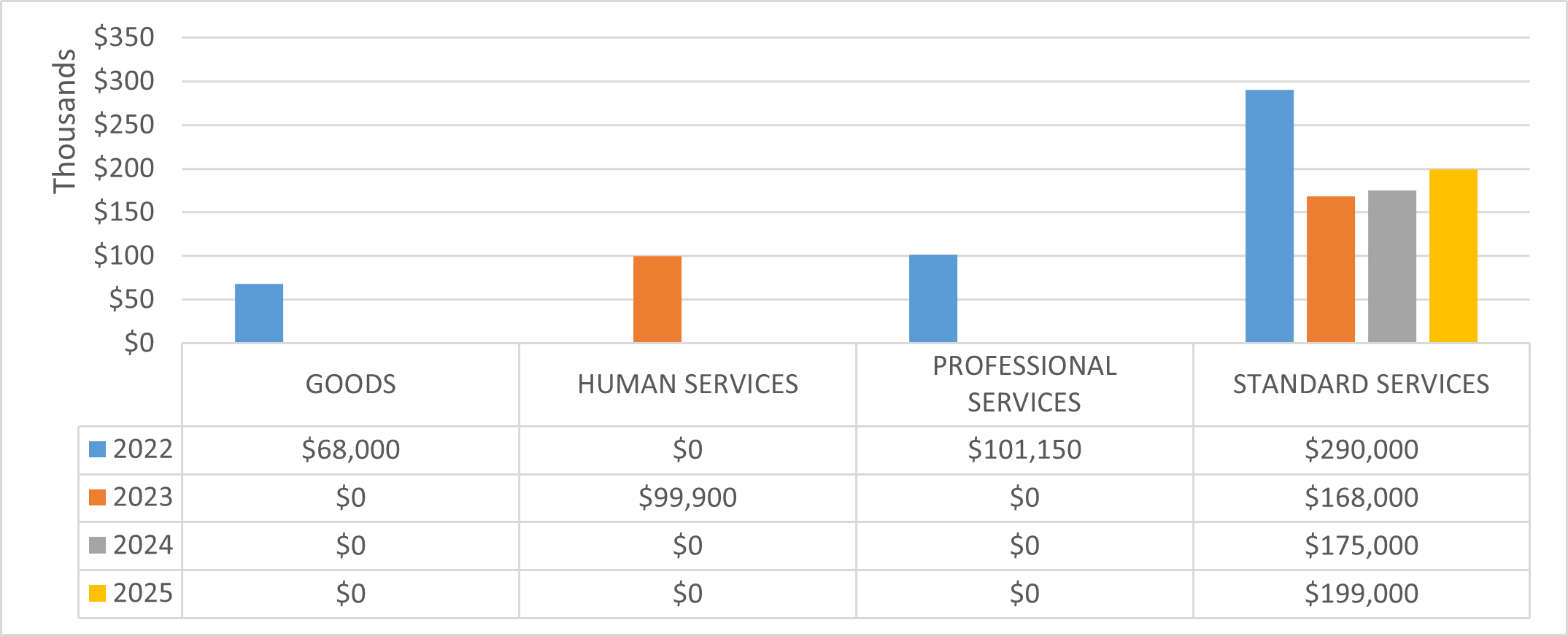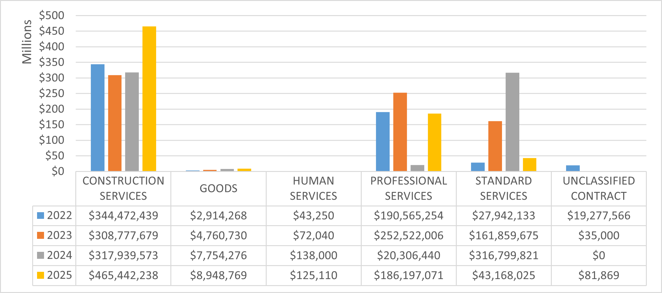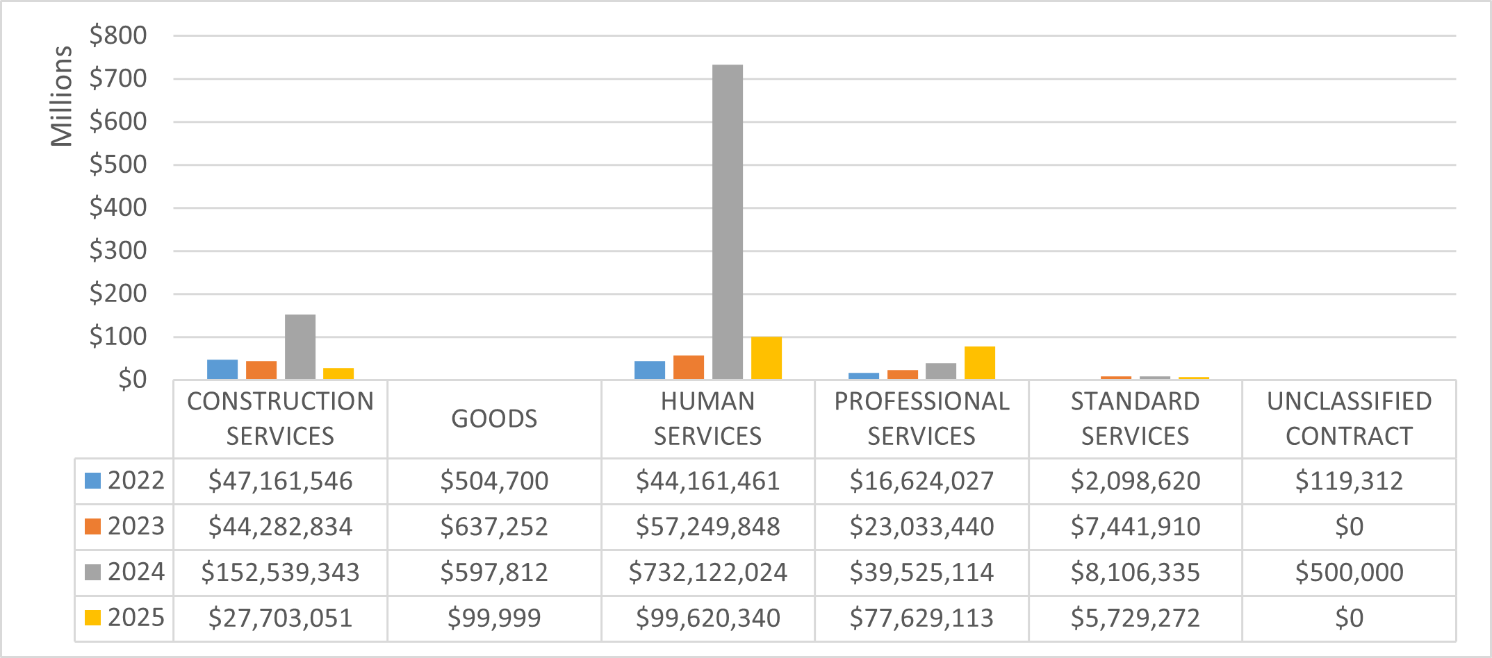 Table 2 illustrates that just ten agencies account for 86.61% of the City’s FY25 procurement value. The Department of Design and Construction (DDC) makes up the largest share (32.11%) of the City’s procurement value. This is because DDC is the contracting agency associated with various billion-dollar borough-based jail contracts.