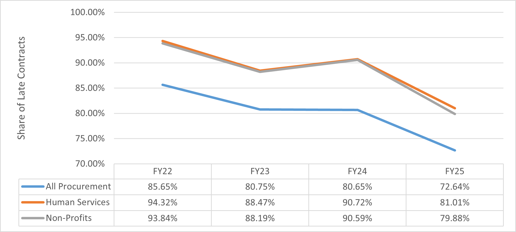 [44]This report relies in an updated methodology from one used in prior Annual Summary Contracts Reports. This year’s analysis excludes DOE purchases under award method 32 (Small Purchase Written), which are actually purchase orders. Through a systems quirk in FMS, DOE purchase orders with values between $20K-$25K are processed under a contractual document label rather than a purchase order label. Due to the high volume of these purchases, and because they are not subject to many of the same requirements as contracts, this report excludes DOE Small Purchase Written records so as not to muddy the picture of Citywide retroactivity rates for contracts.