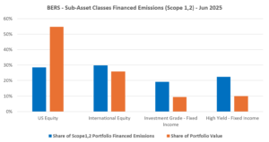 As of June 30, 2025, total public equity and corporate bonds represent about 81% and 19% of the measured public security portfolio’s market value, but their contributions to Scope 1 and 2 financed emissions are 58% and 42%, respectively. U.S. equity has higher total financed emissions but lower financed emissions intensity than international equity. Within fixed income, high yield has higher total financed emissions and higher emissions intensity than investment grade corporate bonds.