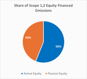While the portfolio’s total passive equity market value is much greater than the active equity market value, the contribution of actively managed equity to Scope 1 and 2 financed emissions is greater than that of the passive equity.