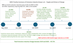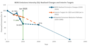 The emission intensity for BERS decreased during FY 2025, after surpassing the interim emission reduction target set for Jun 30, 2025. BERS’ Scope 1 and 2 financed emissions intensity decreased by 24.28% between Jun 30, 2024, and June 30, 2025, yielding a total reduction of 45.72% from the baseline of Dec 31, 2019. While we welcome this decrease in our portfolio’s footprint, it is important to understand and acknowledge the drivers of this change: most of this emission reduction is driven by portfolio and market changes (including changes in securities’ weight and increase in the valuation of companies) while actual company emission decreased as well. (See Section 1.2 for more detail on the attribution analysis.)