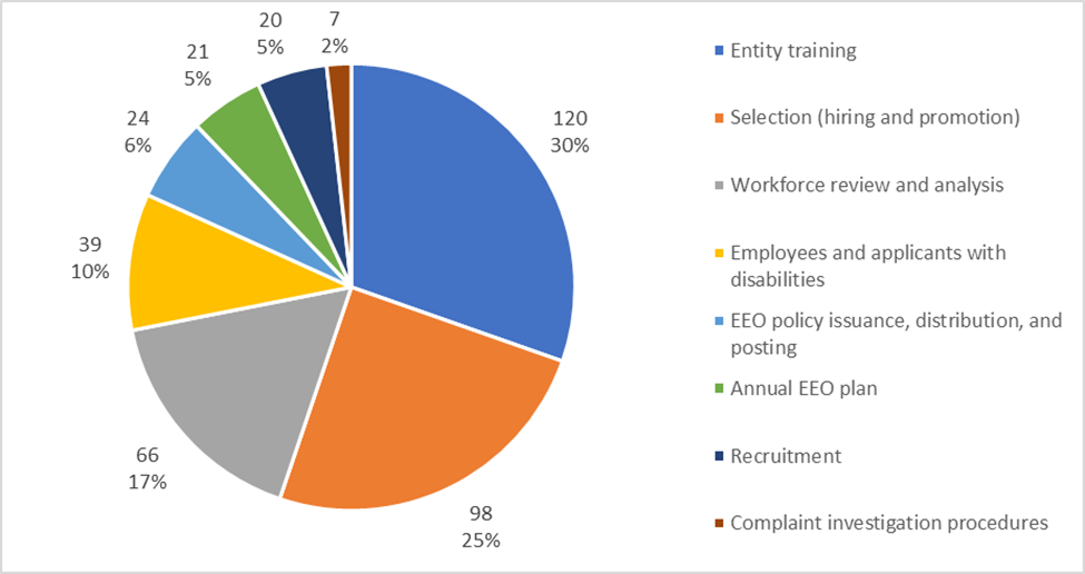 As shown in Table 1, deficiencies in the training of personnel and designating a career counselor were the standards that accounted for the greatest number of CAs issued, followed by annual reviews of workforce data and the maintenance of applicant/candidate logs. As shown in Chart 3, deficiencies related to training and hiring/promotions accounted for more than half (55%) of the CAs issued to agencies.