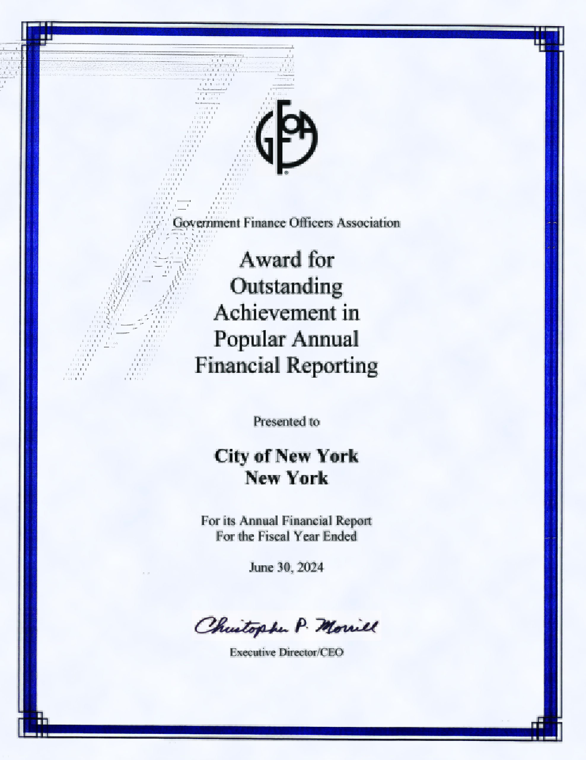 The Government Finance Officers Association of the United States and Canada (GFOA) awarded The City of New York the Award for Outstanding Achievement in Popular Annual Financial Reporting for its Popular Annual Financial Report (PAFR) for the Fiscal Year ended June 30, 2024. The City of New York has received this national award for the last ten consecutive fiscal years. The award recognizes conformance with the highest standards for preparation of state and local government popular reports. In order to receive the award, a governmental unit must publish a PAFR whose contents conform to program standards of creativity, presentation, understandability, and reader appeal. The report must satisfy both generally accepted accounting principles and applicable legal requirements. We believe our PAFR continues to meet the Award for Outstanding Achievement Program’s requirements, and we are submitting it to the GFOA for consideration. The PAFR is a summary of the Annual Comprehensive Financial Report (ACFR) for the year ended June 30, 2025. The financial data in the PAFR derive from the more detailed ACFR.