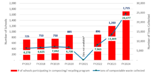 Chart 2. Number of Schools Reportedly Participating in the Composting/Recycling Program versus Tons of Compostable Material Collected (FY2017 through FY2024)