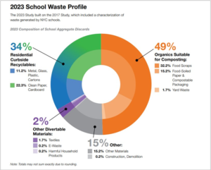 According to data reported by DSNY in its 2023 NYC Waste Characterization Study, food scraps made up 32% of all waste generated by NYCPS schools in FY2023, but only 37% of food scraps generated by schools were captured for composting. Additionally, an analysis of the compostable materials (food scraps, food soiled paper and compostable packaging, and yard waste) collected from schools for composting reveals a contamination rate of 28%, far exceeding the City’s overall organics contamination rate of 4%.