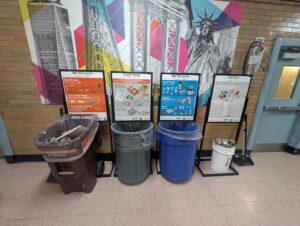 As part of the composting initiative, sustainability coordinators’ training of schools in waste management practices has led to the establishment of student-led “Green Teams” which assist with cafeteria waste sorting. According to the NYC Guide to Clean & Green Schools, published by NYCPS and DSNY, schools are required by law to set up waste, recycling, and composting bins in school cafeterias. Each school should be equipped with sorting stations that follow a standardized four-step process outlined in the Green Guide: disposing of liquids, sorting recyclables, separating compostable items, and discarding non-recyclable waste. This system serves as the universal waste management protocol across all school buildings. At some schools, a “Green Team” is stationed in the school cafeteria next to the waste sorting station, to oversee the proper sorting and disposal of waste. Examples are shown in Photo 3 below.