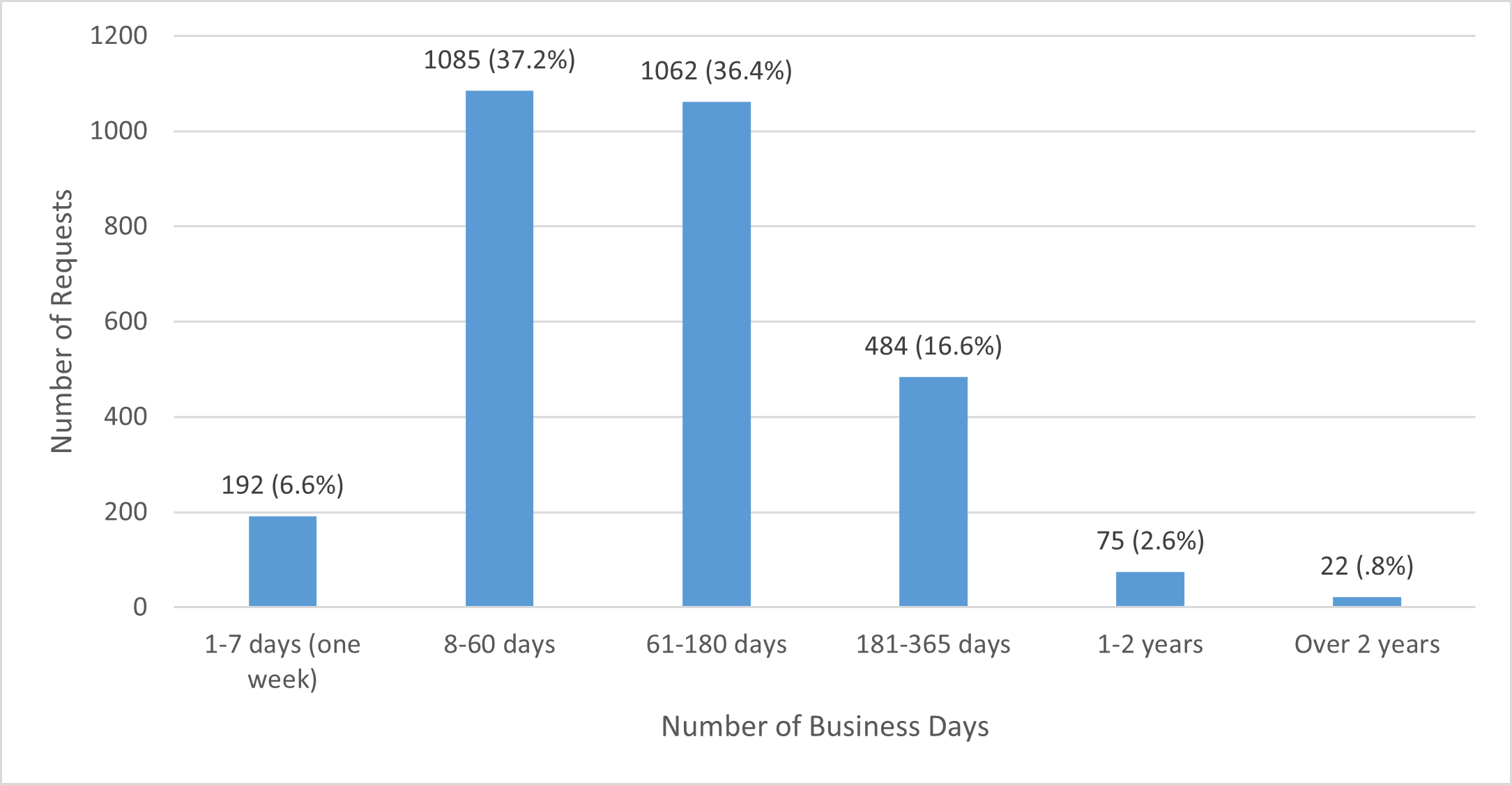 Auditors reviewed 5,427 granted/denied FOIL requests for BWC footage submitted during CYs 2020 through 2024.[12] On average, it took NYPD 133 business days after the FOIL request to make a determination to grant or deny such requests, ranging from zero days (i.e., closed on the same day it was submitted) to more than four years (1,076 business days). Of the 5,427 requests, only 836 (15%) were granted or denied within 25 business days; it took longer than 25 days for the NYPD to grant or deny 4,591 (85%) BWC footage FOIL requests, as shown below in Chart 1.