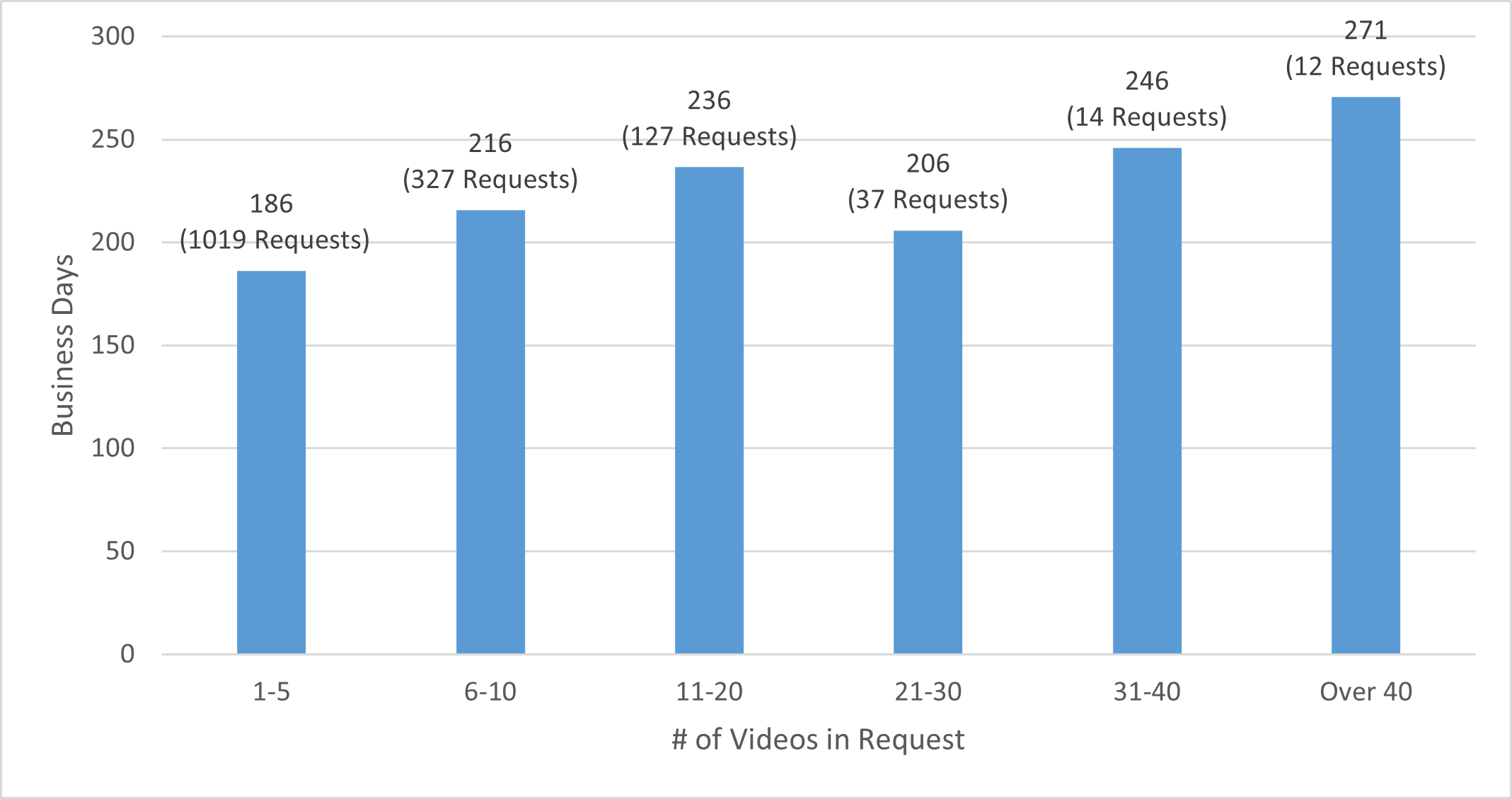 As shown above, for requests that contained one to five videos, NYPD averaged 186 business days to grant the request; for requests with over 40 videos, NYPD averaged 271 business days.