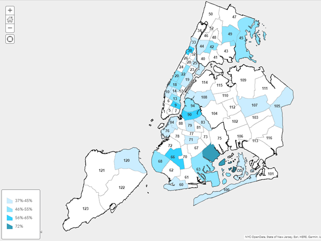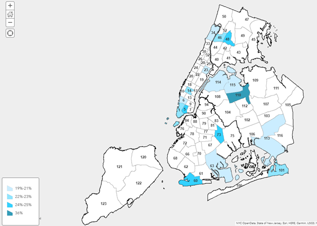 Auditors also aggregated data from ICAD reviews by precinct and found that 32 precincts had higher percentages of no videos on file than the overall average (36%). For 17 precincts the average was between 37% and 45%, for 10 precincts the average was between 46% and 55%, for four precincts the average was between 56% and 65%, and for one precinct the average was 72%. Please see Figure 1 below for a map of the 32 precincts. (Please see Appendix I for a list of the 32 precincts by borough.)