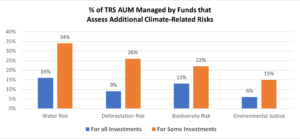 Given the significant climate impact of AI, TRS began reviewing the inclusion of related forms of revenue in its climate solutions portfolio and engaging with both hyperscalers and other portfolio companies on this issue (see additional detail in the corporate engagement section). Additionally, TRS has requested that MSCI review its environmental impact metrics definitions as well and has committed to participate with other investors in such a review. The results of these reviews and engagements will inform potential changes to TRS’s definitions (and reporting) of climate solutions.