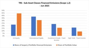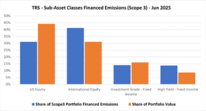 Between June 2024 and June 2025, the Scope 3 finance emission of public equity financed emissions decreased for the TRS portfolio, while overall fixed income’s financed emissions increased.