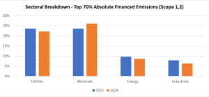 The Utilities and Materials sectors are the highest emitting sectors among the top 70% of Scope 1 and 2 financed emissions, representing 24% and 24% financed emissions of the group, respectively. This information continues to be critical to our engagement activities.