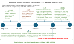The emission intensity for TRS decreased during FY 2025, after surpassing the interim emission reduction target set for Jun 30, 2025. TRS’ Scope 1 and 2 financed emissions intensity decreased by 16% between Jun 30, 2024, and June 30, 2025, yielding a total reduction of 49% from the baseline of Dec 31, 2019. While we welcome this decrease in our portfolio’s footprint, it is important to understand and acknowledge the drivers of this change: most of this emission reduction is driven by portfolio and market changes (including changes in securities’ weight and increase in the valuation of companies) while actual company emission decreased as well. (See Section 1.2 for more detail on the attribution analysis.)