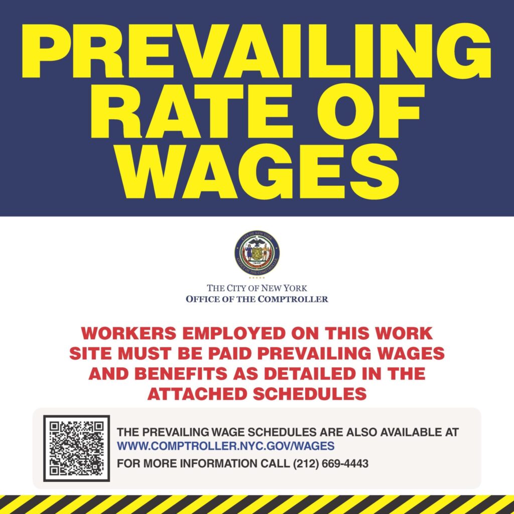 All employers covered by prevailing wage and living wage requirements must post the Prevailing Wage/Living Wage Worker Notice along with wage schedules for all applicable trade classifications in a conspicuous manner at each covered job site. In addition, contractors and subcontractors on public work projects must distribute the Prevailing Wage/Living Wage Worker Notice, along with prevailing wage schedules for all applicable trade classifications to all covered employees at the beginning of the performance of each public work contract, and with each covered employee’s first paycheck after July first of each year.